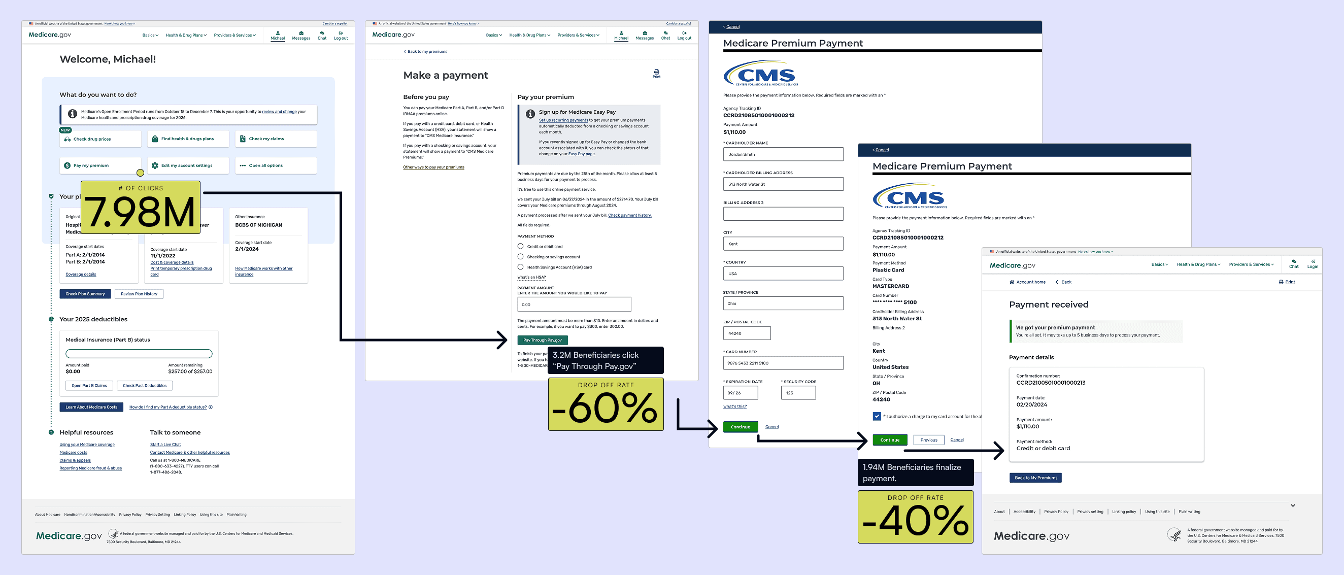 Between June 2023–March 2024, over 8 million beneficiaries began a payment flow, yet only 41% completed it, and 61% of those successfully submitted. Completion rates were far higher when users entered from contextual pages (like Premium Bills or Payment History) rather than Account Home, where they lacked clarity about what they owed.